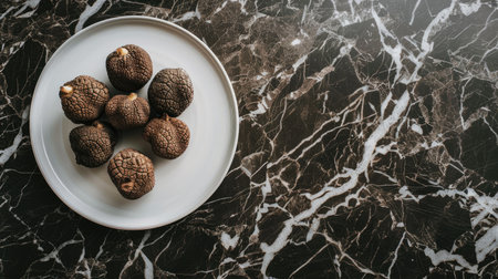 A gourmet dish featuring truffles on a white plate, set against a luxurious dark marble background.