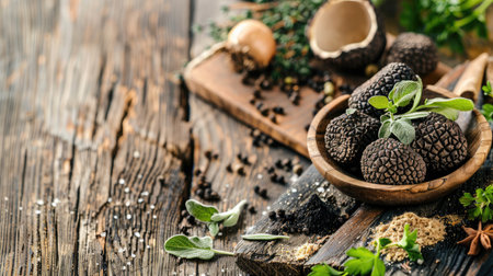 Truffles on a beautiful rustic wooden background, surrounded by herbs and spices for a natural setting.
