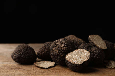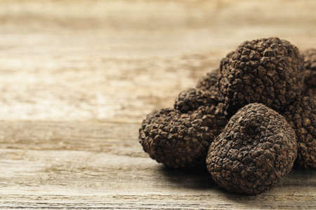 A close-up of fresh black truffles with their distinctive rough texture and dark color, set against a rustic wooden background to highlight their natural beauty.