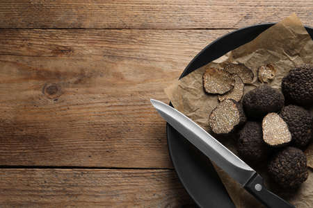 Wooden shaver with whole and sliced truffles on black table, flat lay. Space for text