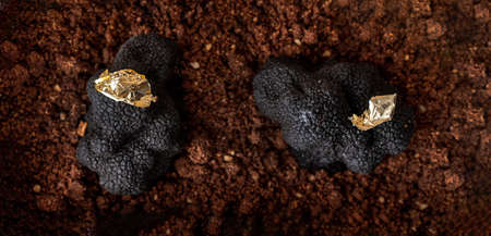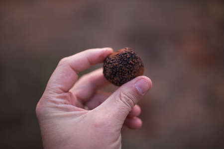 Black truffle in the ground. Truffle hunt. Mushroom cultivation. Delicacy exclusive truffle mushroom. Piquant and fragrant French delicacy.