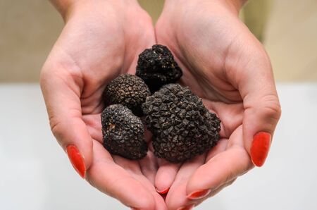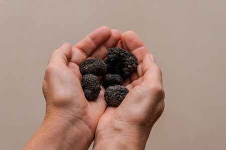 A handful of black truffles in a woman's hands. Exquisite and fragrant mushroom. Unrecognizable person. Black background. Close up. Copy space. Top view.