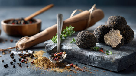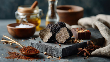 Discover the rich textures and flavors of fresh black truffles alongside vibrant spices in this stunning rustic kitchen setup. Perfect for culinary inspiration.