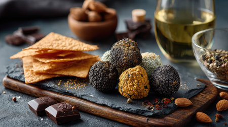 A beautifully arranged gourmet snack platter featuring truffles, chocolate, nuts, and crispy crackers on a rustic slate board. Perfect for gatherings.