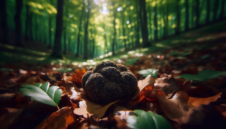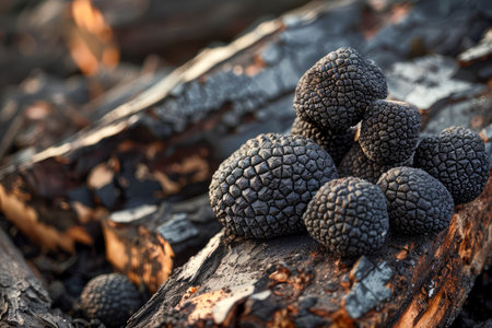Fresh Black Truffles on a Wooden Log in Natural Forest Environment with Golden Sunlight AI Generative