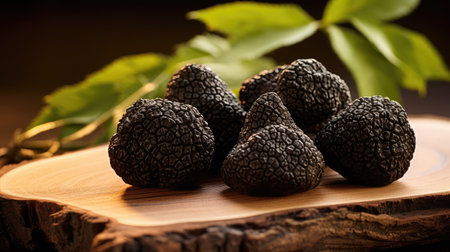 The Elegance of Black Truffles: A Culinary Display on a Rustic Wooden Board. Concept Black Truffles, Culinary Display, Rustic Wooden Board, Elegance, Gourmet Experience