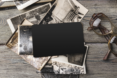 Stack old photos on table. Mock-up blank paper. Postcard rumpled and dirty vintage. Retro card