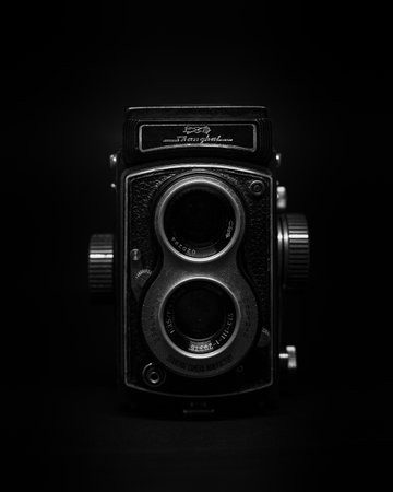 Vintage film camera on a wooden table and black background with film lens and camera shot in low key dark style
