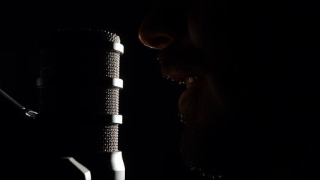 Close-Up of a Speaker Recording Voice in a Dark Studio