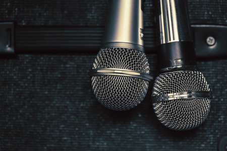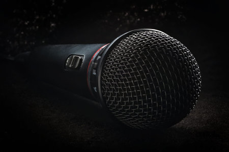 Black microphone dropped to the black wooden floor.Musical instrument for singing and karaoke.