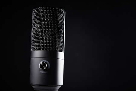 Studio microphone on dark background with copy space. Black professional condencer microphone, close up. Podcast recording