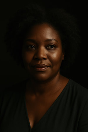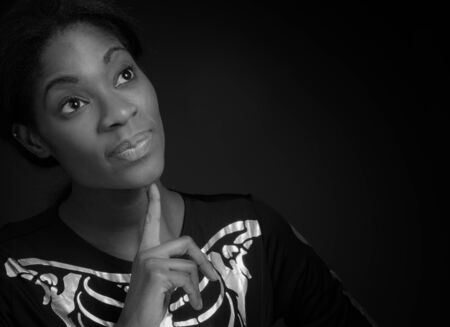 Young african woman wearing black sweater sitting on a chair in a black background. Studio shot.