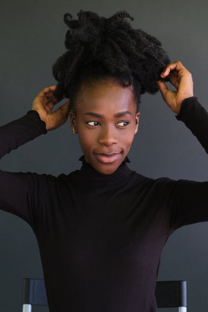 portrait african american beautiful woman creative hair coloring dye purple color on white background in studio sexy spy in a black t-shirt