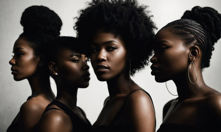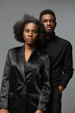 Portrait of a fashionable Afro American couple showcasing confidence and style on a neutral backdrop, ideal for concepts related to love, beauty, and modern relationships