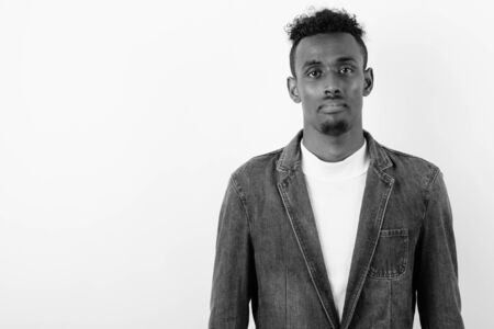 Studio shot of young happy black African nerd man smiling and wearing Geek shirt against white background