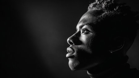 closeup portrait of a charming handsome black man with closed eyes in black and white light.