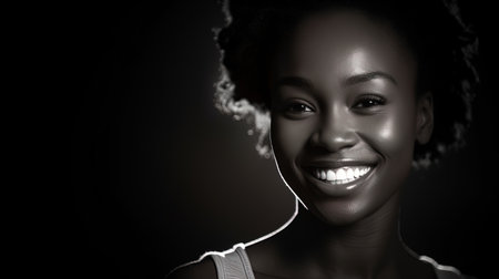 Closeup portrait of a black smiling American man with big lips in black and white light.