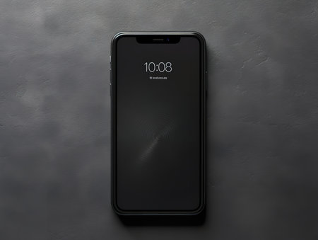 A working desk with modern mobile phone blank screen mockup, keyboard, and decor on leather black surface, top view, overhead