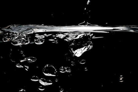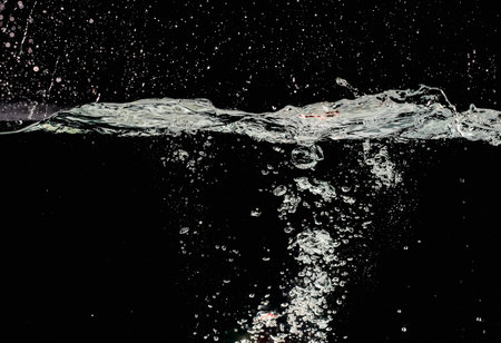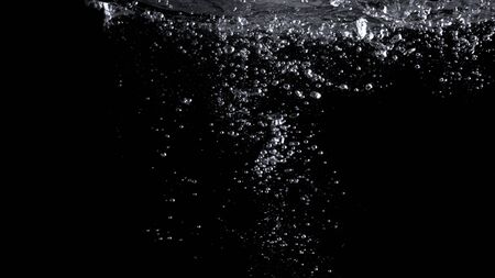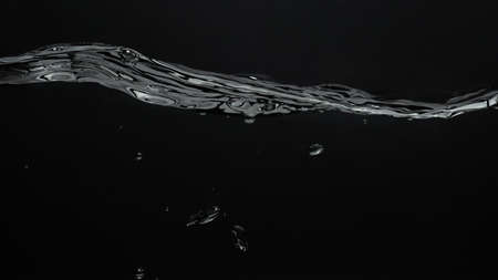 Liquid suface line between underwater and above water with black background. Show water bubble splashing and floating drop. Close up water bubbles texture and curve line of surface. Film grain style.