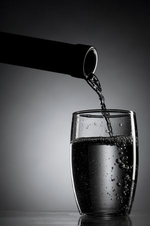 Pouring purified fresh water in glass on mirror background