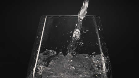 Ice water pouring wineglass closeup. Crystal clear bubbled liquid with ice cubes in transparent glass. Mineral aqua with air drops black background. Preparing refreshing cocktail concept