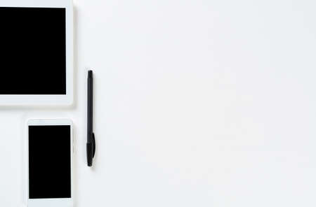 Top view of modern office workplace. Smartphone, pen and tablet computer on white surface. Mobility and online communication concept with copy space. Digital technology in modern business.