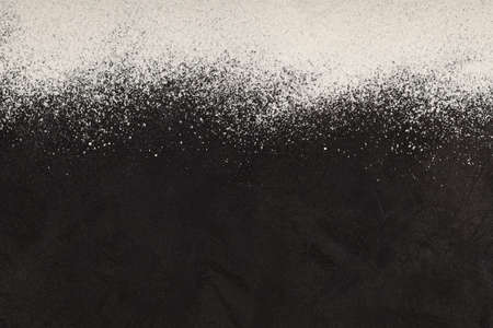 Sifted wheat flour over black surface top view with copy space. Food background.