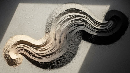 rock garden white pebbles on black sand, wavy patterns.