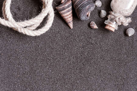 Black sand with pebbles. Beach background with space for your own text