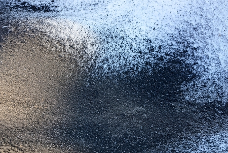 Close-up of black and white sand on the asphalt road.