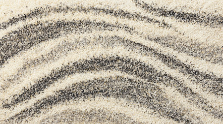 Close-up of dark sand with distinct wavy patterns illuminated by soft light. Clear details and vibrant colors ...