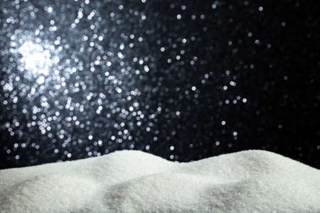 white crystals on black glitter background. Abstract winter scenery.