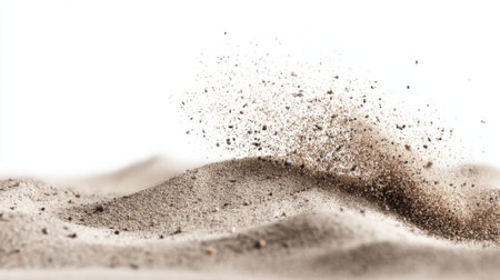 A gust of wind lifts fine dust off a sandy surface, creating a dynamic spectacle against a neutral backdrop. The grains of sand dance and scatter in the breeze, emphasizing movement.