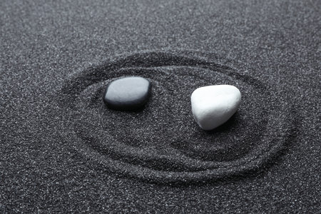 Yin Yang symbol made with stones on black sand. Zen concept
