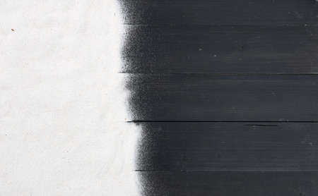 White sand scattered on dark wooden planks, creating a natural, minimalist background perfect for beach, spa, or tropical-themed designs.