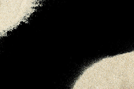 Heap dust beach texture on shore background. Pile desert sand isolated on black. Vacation backdrop with space for the text