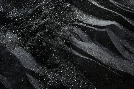 Detailed close-up showcases the texture of black sand interspersed with small rock fragments and glistening particles, ideal for geological study or abstract backgrounds.