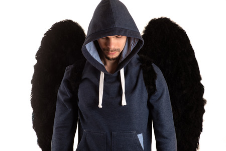 young man in gray jacket with hood thrown over his head standing with his hands and looks down on his back and black wings