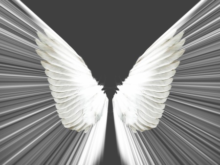 A pair of large, white angel wings set against a stark black backdrop. The image evokes feelings of spirituality and freedom.