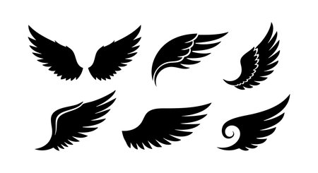 This vector features six black silhouette bird wings in various stylized shapes and angles, perfect for design projects and creative use, rendered in flat style. Elegant and versatile.