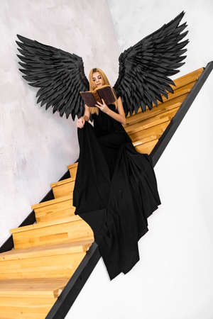 Black angel with a book in his hands on the stairs. A young girl with black angel wings in a black long dress.