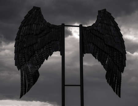 iron wings against the backdrop of a formidable sky, hope and strength, atmospheric photography in black and white