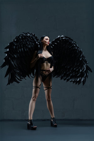 Attractive sensual woman posing in black angel costume with big wings.