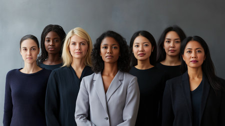 Diverse group of confident women standing side by side, showcasing different beauty and ethnic backgrounds. Unity and empowerment concept.