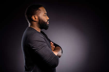Profile side photo of afro american guy look copyspace cross hands hope inspire stop racism wear jumper isolated over black color background