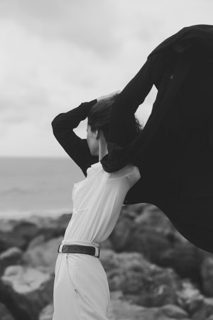 White dress on a windy beach, cape sweeping behind, figure facing the sea, dramatic motion in a monochrome scene, bold fashion photography with natural light
