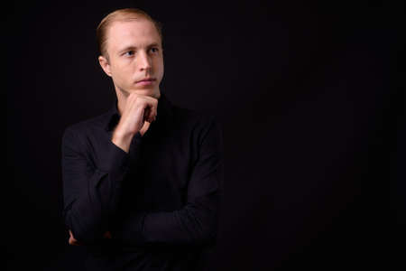Businessman with blond hair against black background