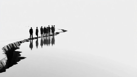 Five figures are silhouetted against a foggy backdrop. The image features a monochromatic color scheme, with high contrast highlighting the shapes. The composition suggests an atmospheric setting. It may be suitable for illustrating concepts of teamwork, anonymity, or collective identity, and has potential commercial and editorial applications.