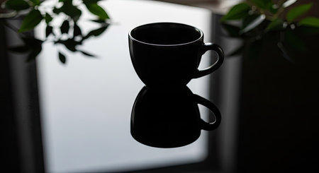 Coffee cup on a black table in the morning light.