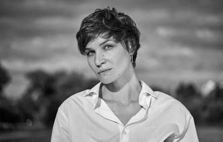 Retro portrait of a stylish beautiful woman in a white shirt on the background of a sunny meadow. The concept of style and fashion.